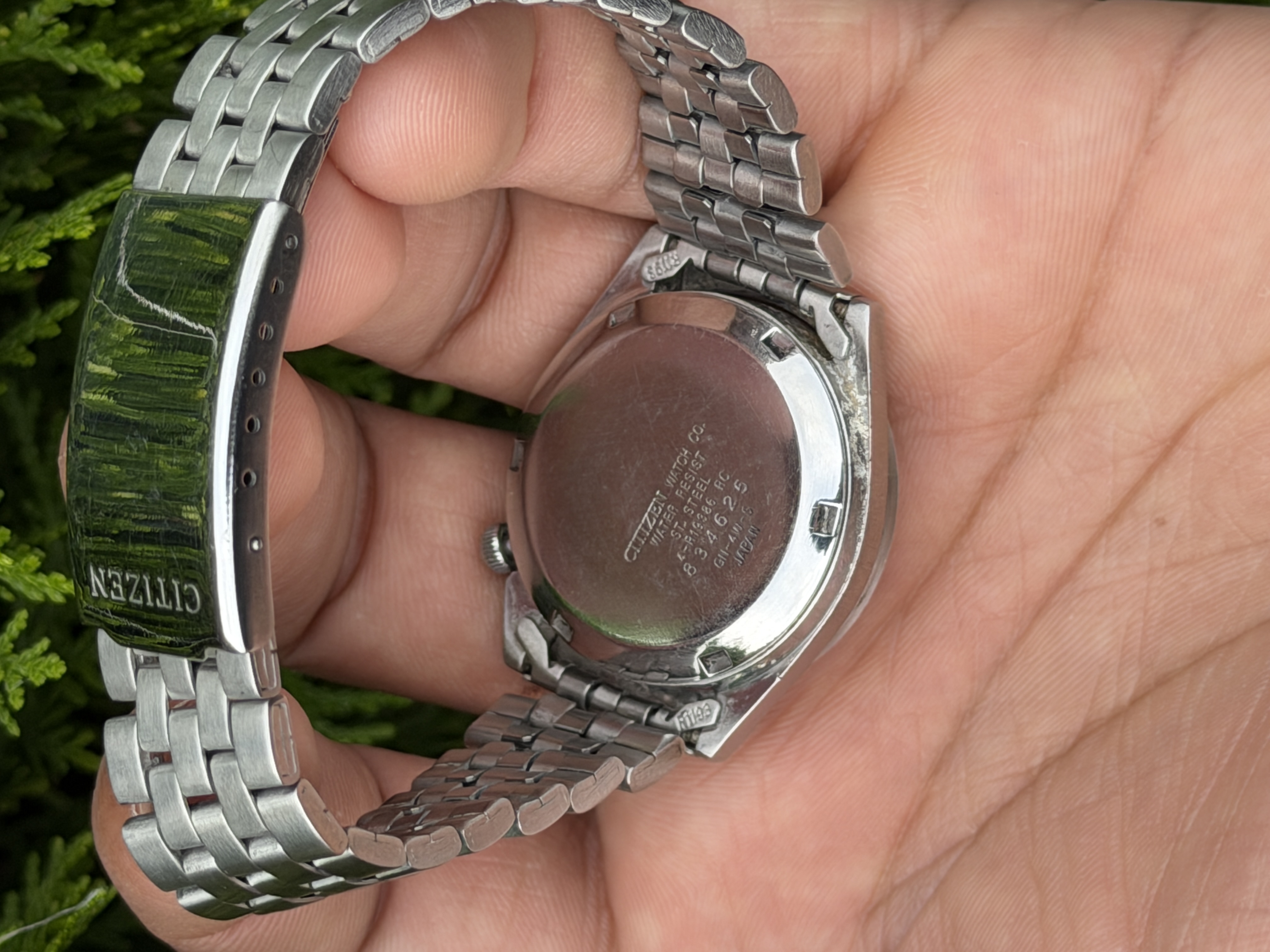 Black-dial Citizen automatic with gold accents, day-date, and jubilee bracelet.