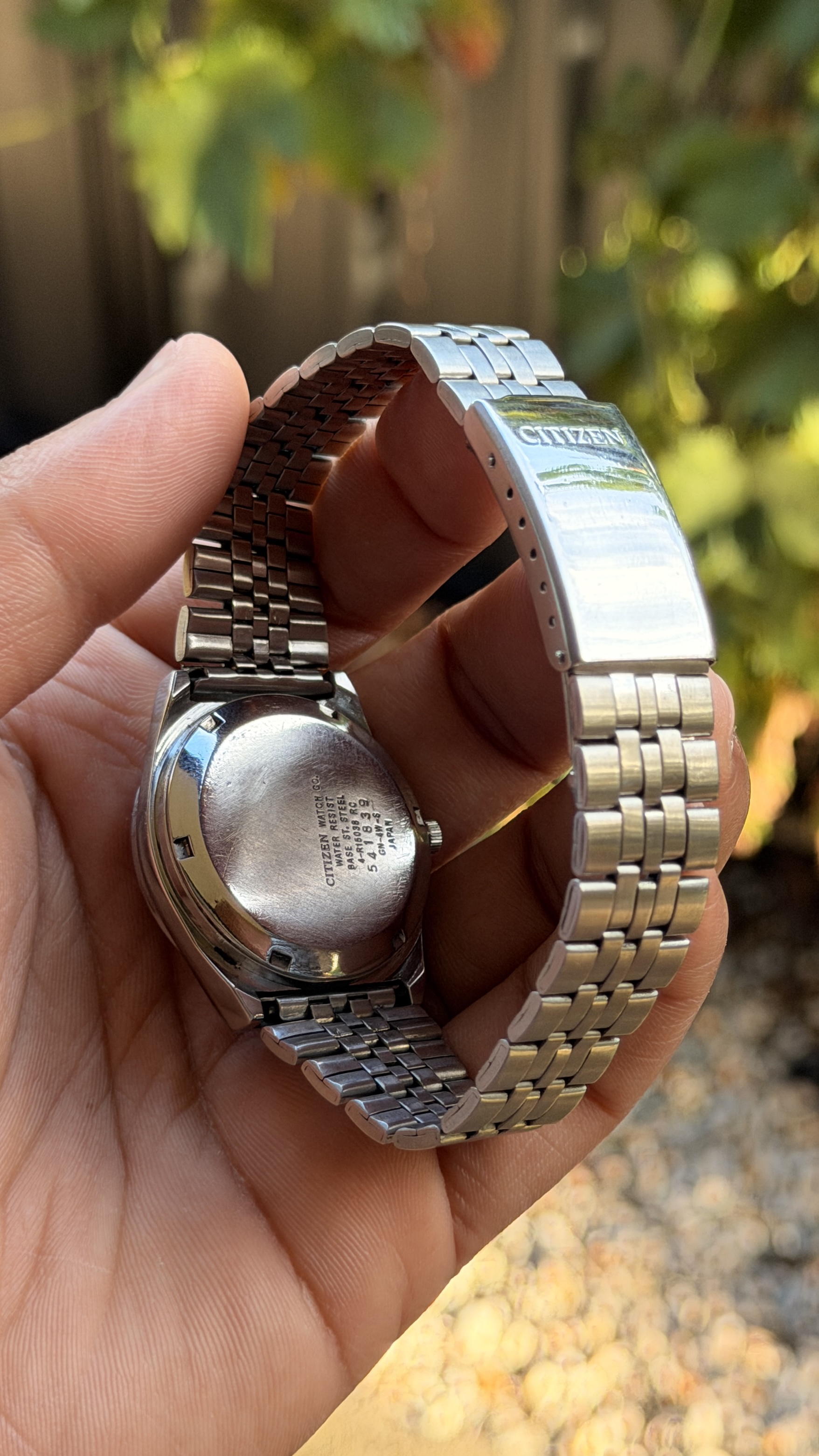 Champagne-gold Citizen automatic with day-date and classic jubilee bracelet.