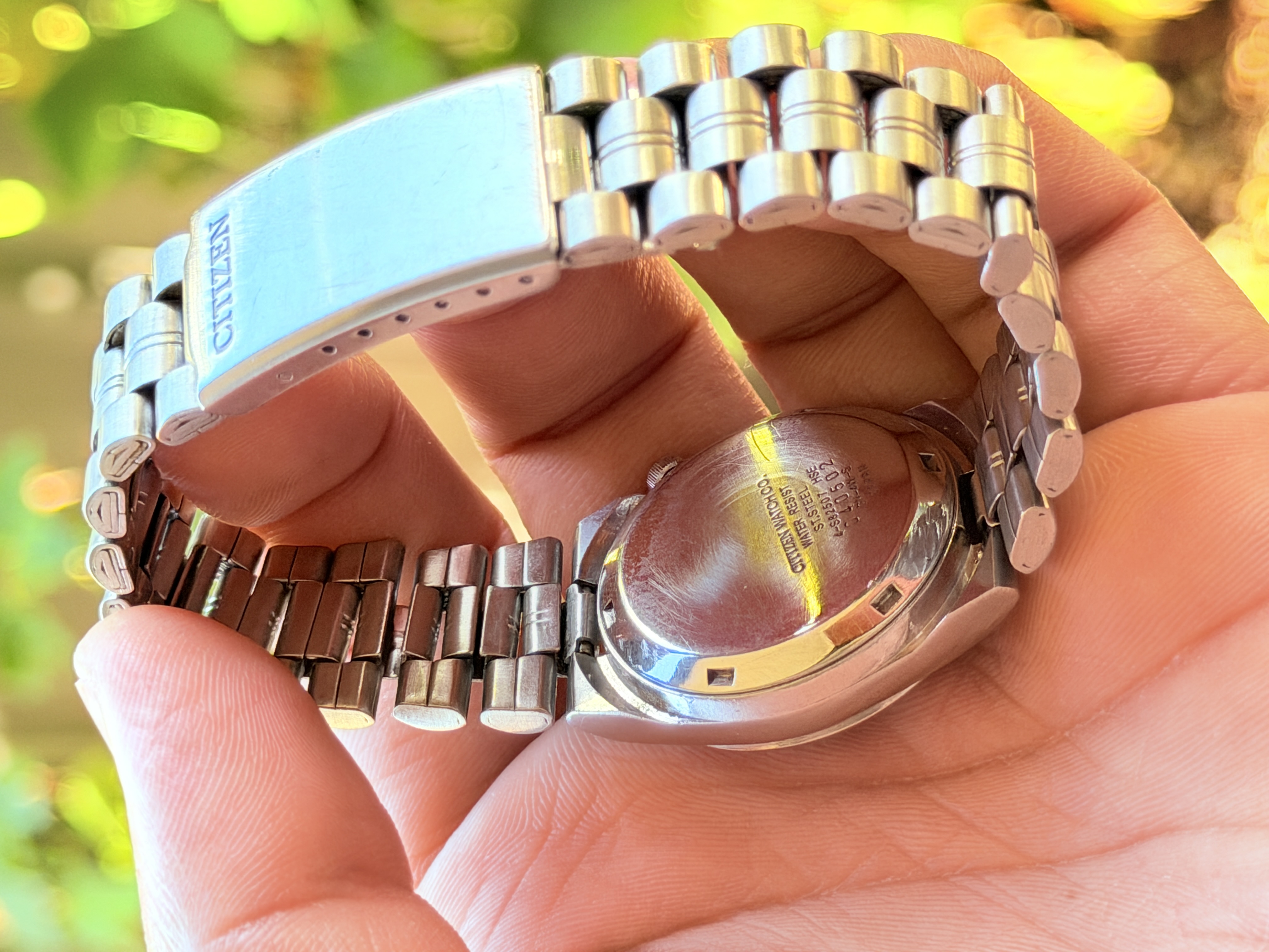 Unique green and gold two-tone dial Citizen automatic with geometric pattern.