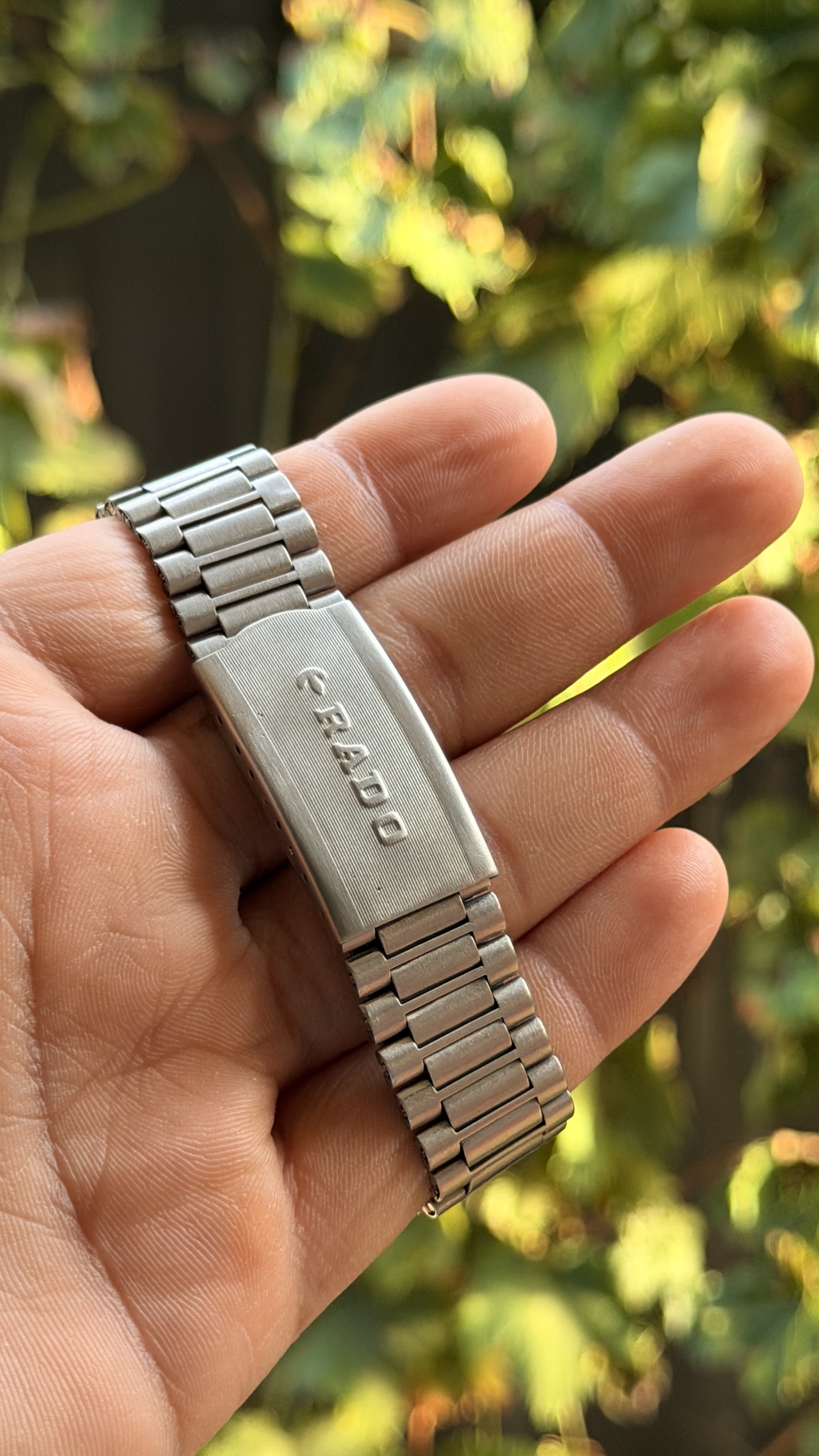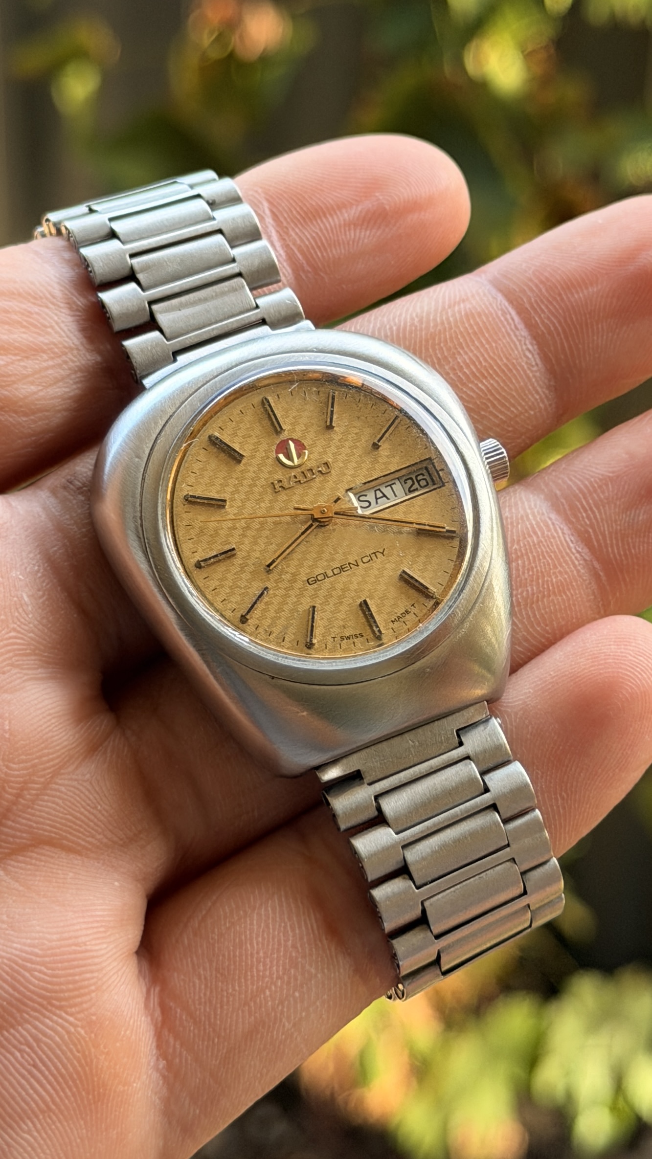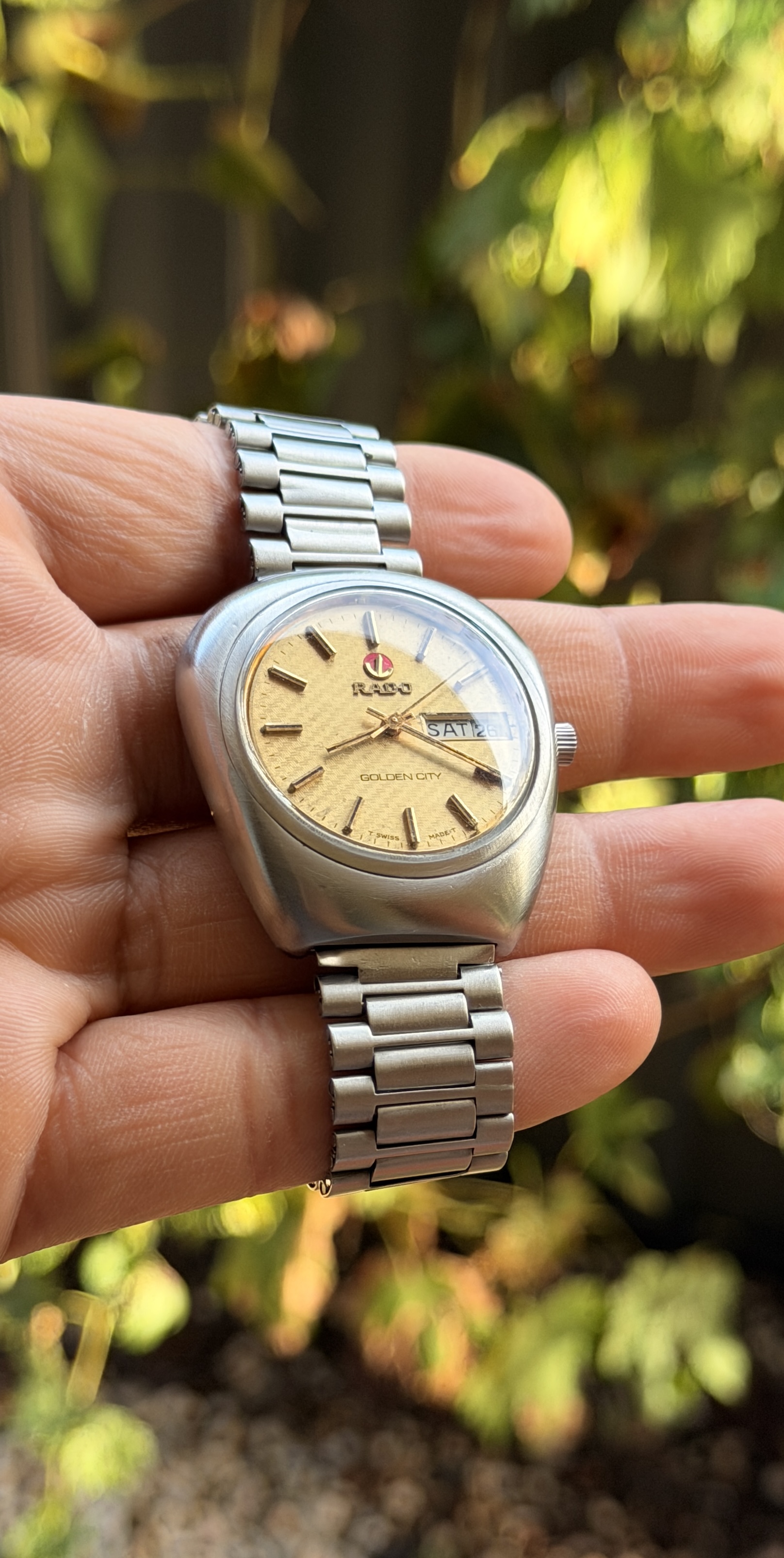 Swiss Rado Voyager with gold textured dial, day-date, and distinctive case shape.
